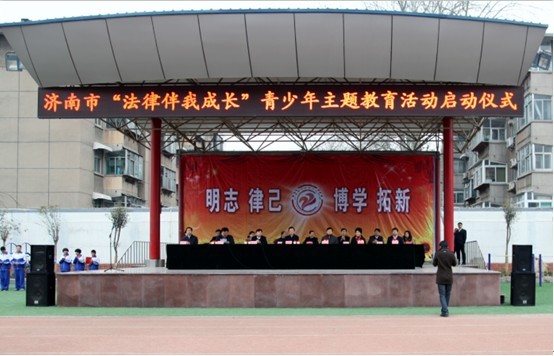 启动仪式由团市委副书记徐龙义主持。出席活动的领导向学生代表赠送了普法书签和法律书籍。市普法办公室主任、市司法局局长毛华铭作了讲话。他指出,加强青少年法制宣传教育是今年法治济南建设的一项重点任务。开展“法律伴我成长”青少年主题教育活动的目的,就是为了提高青少年学生的公民意识、法律素质和依法维权能力,不断增强青少年明辨是非、抵御不良影响、预防违法犯罪的能力。围绕开展好“法律伴我成长”青少年主题教育活动,我市今年将通过免费发放普法书籍和书签,举办青少年法律知识电视大奖赛、有奖征文、法制动漫征集、法制文艺汇演等丰富多彩的法制宣传活动,在全市中小学和广大青少年中掀起一个学法尊法守法用法的新热潮。他倡议,政府、社会、家庭和学校要共同关注、支持青少年法制宣传教育工作,为广大青少年的健康成长营造良好的法治环境和社会环境,为培育一代又一代有理想、有知识、有作为、文明守法的中国特色社会主义合格人才做出应有的努力!