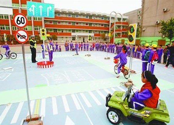 划有各种交通标线的路口、红绿灯、小汽车、小自行车等一应俱全,学生在校园内即可体验各种路口交通安全问题。4月16日,由槐荫区教育局与槐荫交警联合推出的济南首个“微缩版可移动路口”交通安全模拟系统正式亮相济南市闫千户小学。据了解,针对闫千户小学周边交通环境复杂等因素,为保障学生上下学的人身安全,增强学生的自我安全意识,槐荫区教育局专门与交警部门联合研制了该交通安全模拟系统,让小学生可进行各种交通场景的模拟演练,让他们切实感受到不文明交通违法行为所带来的安全隐患。