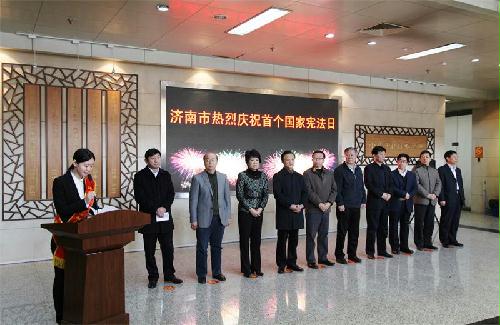 12月4日是首个国家宪法日,我市在英雄山北广场举行国家宪法日庆祝活动。市委常委、政法委书记李占国,市人大常委会副主任许强,副市长齐建中,市政协副主席李好臣出席活动。