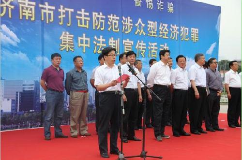 5月24日,市普法办、市司法局举办“拒绝诱惑•警惕诈骗”——济南市打击防范涉众型经济犯罪集中法制宣传活动。市委常委、政法委书记李占国,市人大常委会副主任许强,市政协副主席李好臣出席活动。市普法办主任、市司法局局长谢圣仁致辞,市普法办专职副主任皇甫庆森主持活动启动仪式。