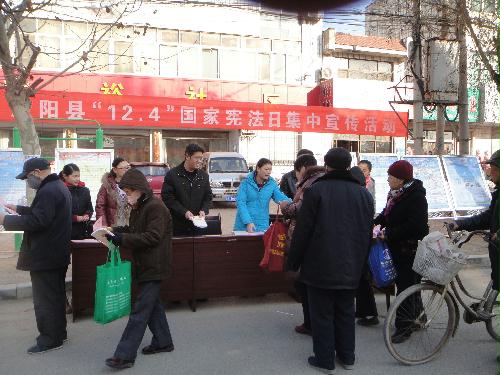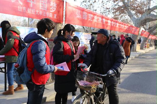 四是开展百镇千村“宪法六进”活动,让宪法走进百姓生活。章丘市组织全市政法系统联系20个镇(街道)、920个村(居)的500余名政法干警和法律服务人员,通过召开座谈会、开展法律咨询活动、举办宪法专题讲座或展览等形式,深入城乡村居(社区),讲解、宣传宪法知识和宪法精神,宣传预防涉众型犯罪有关知识,增强居民法治意识。市中区将宪法主题活动与“法治六进”活动相结合,组织机关干部、150名律师和志愿者队伍到社区、街头,为市民讲解宪法知识,引导市民自觉学习宪法法律,讲权利、讲义务,共同营造和谐稳定社会环境。高新区检察院走进开发区企业,为中铁十局房地产公司、中铁置业济南公司等企业职工举办了宪法专题讲座,强化职工宪法法律意识,起到了良好的警示教育作用。商河县司法局开展“宪法进校园”活动,宣讲人员走进校园,采取以案说法的方式,用真实的案例教育告诫学生们自觉遵守宪法和法律;结合答题、竞猜等互动游戏,在趣味娱乐中增强了他们明辨是非和依法维权的能力。市法制办举办宪法和公共法律知识竞赛,在济南日报刊登竞赛试题答题卡,全体市民广泛参与。
