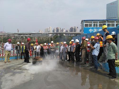 消防队员对《消防法》、消防安全的重要性、消防器材的使用、初级火险的扑救等作了详尽的讲解后开始消防演练。假设施工现场因工人用火不慎起火,现场浓烟滚滚。“火灾”发生后,救援工人第一时间拿起灭火器实施灭火,并向项目经理报告。接到火情报告后,项目经理立即启动应急预案,拨打119火警和120急救中心电话。施工现场义务消防队全体队员紧急集结,手持灭火器冲上着火点,启动消防水泵,实施灭火,警戒保卫组在施工现场出入口设置警戒线,引导工作人员及时疏散并清理通道,保障车辆进出;疏散组迅速组织在施工人员从疏散通道撤离,并对疏散人员进行清点登记;通讯组即时通报救援情况,确保救援现场通信畅通;抢险组利用灭火器等设备对着火点进行灭火。5分钟后,火势得到有效控制,明火被扑灭,现场施救完毕,演习成功结束。